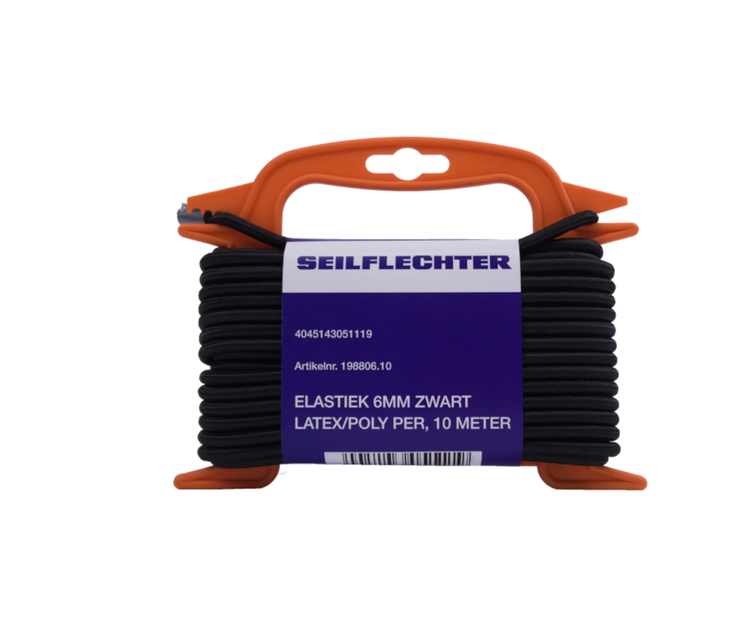 Elastiek, geproduceerd door Seilflechter is geheel zwart en heeft een diameter van 6mm met een lengte van 10mtr. De kern is vervaardigd van hoogwaardig latex met een polyester gevlochten mantel. Het elastiek is UV bestendig, heeft een rek van 130% en is gewikkeld op een herbruikbare haspel.
