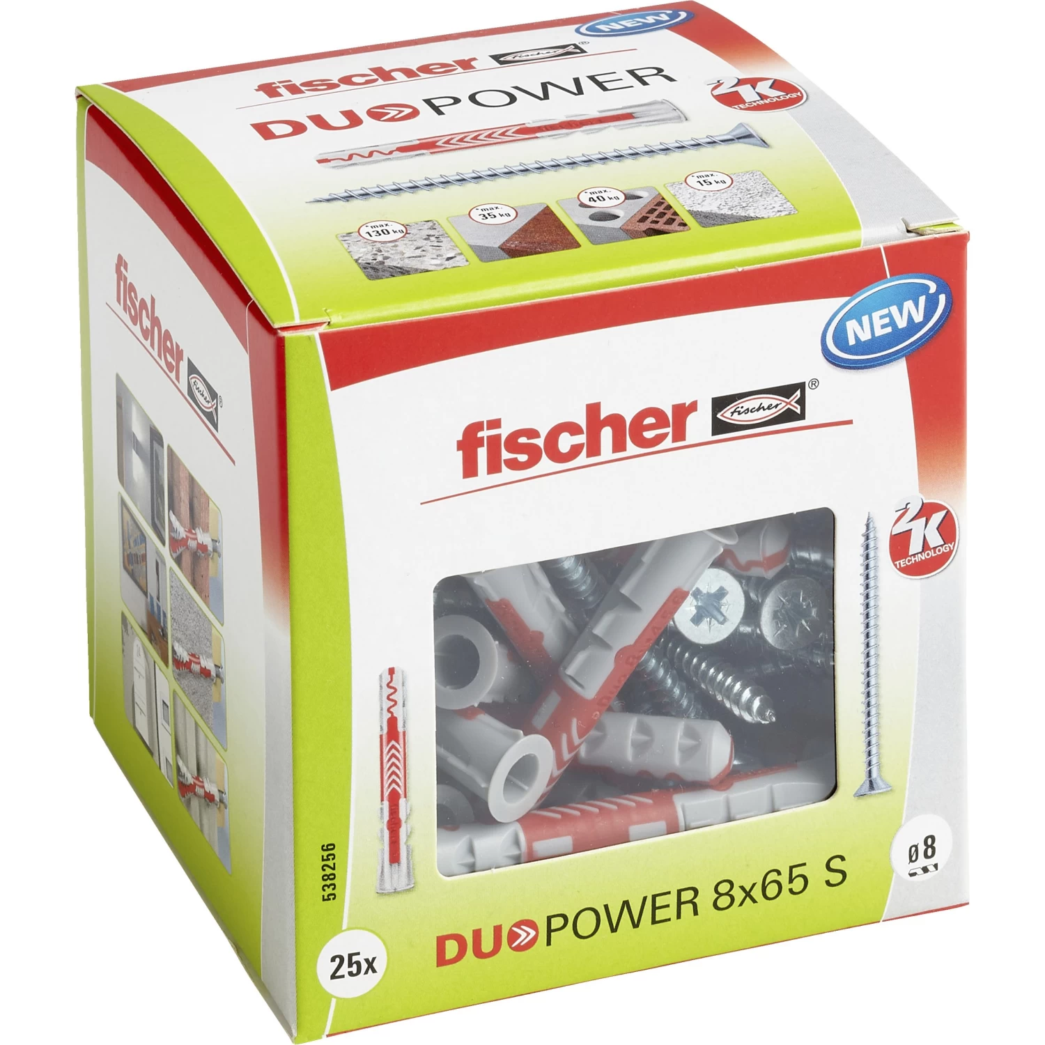 De Duopowerplug 8×65 mm met schroef is geschikt voor zowel voor- als doorsteekmontage. Meer materiaal in de plug voor nog meer spreiding en nóg hogere belastbaarheid. De combinatie van een harde en zachte kunststof garandeert een optimaal gebruiksgemak, zeer gemakkelijke plaatsing en bovendien een duidelijke feedback wanneer de plug correct geplaatst is. Geschikt voor hout- , spaanplaat- én stokschroeven. Schroeflengte = pluglengte + dikte aanbouwdeel + 1x schroefdiameter. In het geval van plaatmateriaal dient het gladde deel van de schroef niet langer te zijn dan de dikte van het aanbouwdeel. De combinatie van 2 materialen en 3 werkingsprincipes maakt de DUOPOWER de juiste plug voor alle omstandigheden. De plug activeert het optimale werkingsprincipe – spreiden, vouwen, knopen – afhankelijk van de ondergrond. Best mogelijke terugkoppeling van de plug, het is duidelijk voelbaar wanneer de schroef goed is aangedraaid. De korte en compacte plug staat voor minimale boortijd en bespaart daarmee materiaal én tijd. De dunne kraag voorkomt dat de plug in het boorgat verdwijnt bij gebruik in holle wanden, terwijl doorsteekmontage nog steeds mogelijk blijft. De vertande anti-rotatievleugels voorkomen dat de plug tijdens montage in het boorgat meedraait. Verpakking is 25 stuks incl. schroeven in de maat 5×80 mm.
