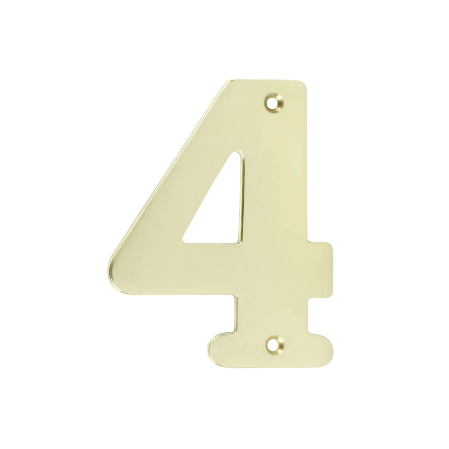 Dit huisnummer is gemaakt van messing en heeft een afmeting van ongeveer 9 cm breed en 11 cm hoog. De afstandnokjes aan de achterkant zorgen dat het nummer loskomt van de te bevestigen achtergrond. Dit huisnummer is nummer 4.