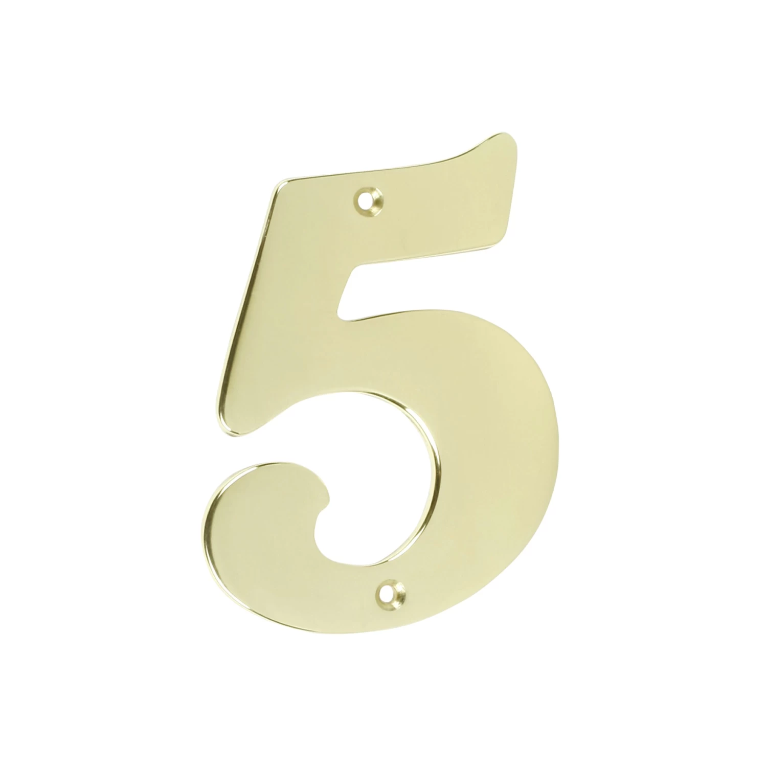 Dit huisnummer is gemaakt van messing en heeft een afmeting van ongeveer 9Â cm breed en 11Â cm hoog. De afstandnokjes aan de achterkant zorgen dat het nummer loskomt van de te bevestigen achtergrond. Dit huisnummer is nummer 5.