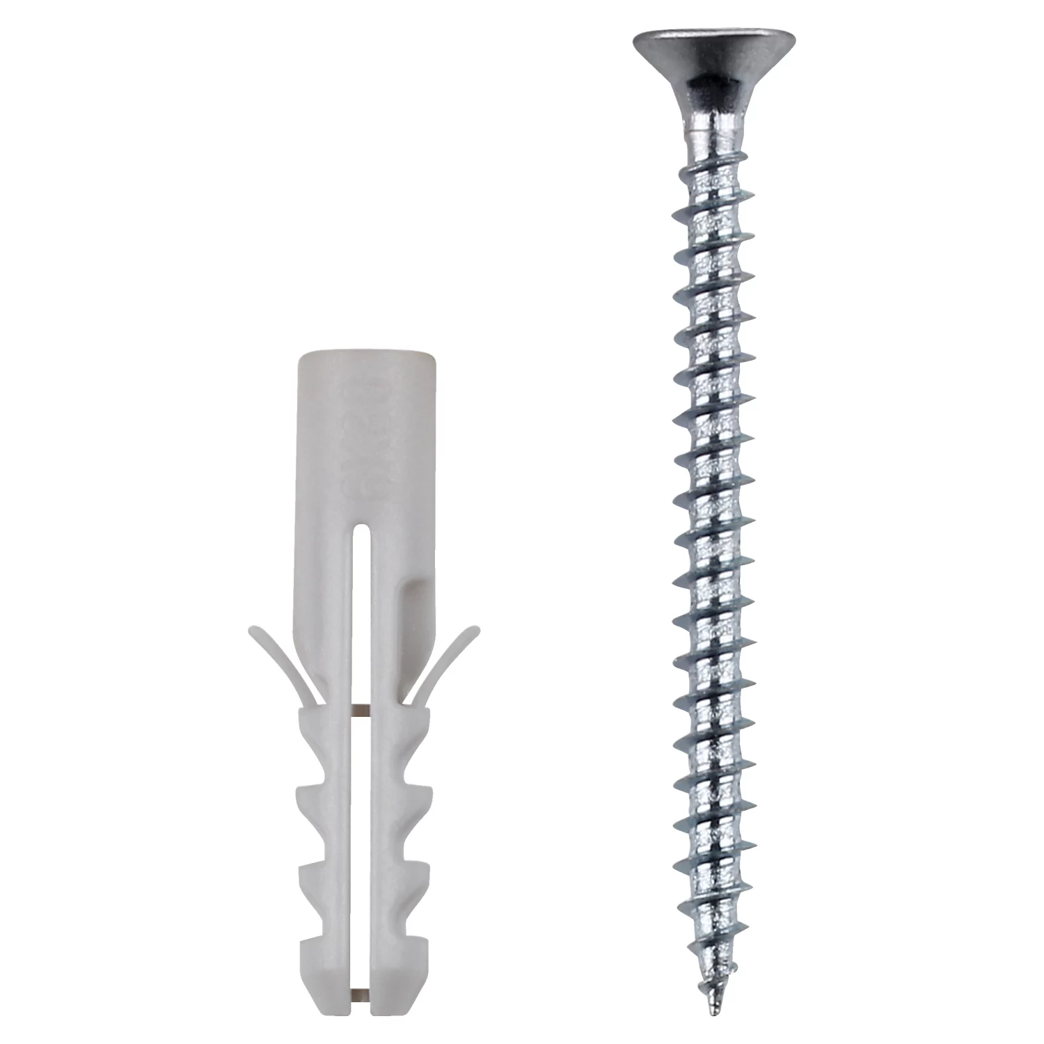 De KARWEI Basisplug nylon Ø 6mm met schroef, de meest gebruikte plug voor toepassing in massieve bouwmaterialen, zoals beton en massieve steen. U koopt de basisplug per 300 stuks, inclusief universeelschroef vz van 4x40mm . De basisplug is 30mm lang en heeft diepe vertanding .Zo bevestigt u met deze plug en houtschroef middelzware materialen aan muren en wanden, bijvoorbeeld schilderijen, plinten en legplanken. De universeelschroef vz middelzware materialen aan muren en wanden, bijvoorbeeld schilderijen, plinten en legplanken. De universeelschroef vz roest niet waardoor u deze ook buiten of in natte ruimtes, zoals de badkamer, kunt toepassen. De universeelschroef vz is 4mm dik en 40mm lang. Voorboren met een boormaat van 6mm benodigd. Dan zorgt u voor de meest stevige bevestiging. De verpakking bevat in totaal 300 basispluggen van 6mm dikte met bijbehorende universeelschroef vz