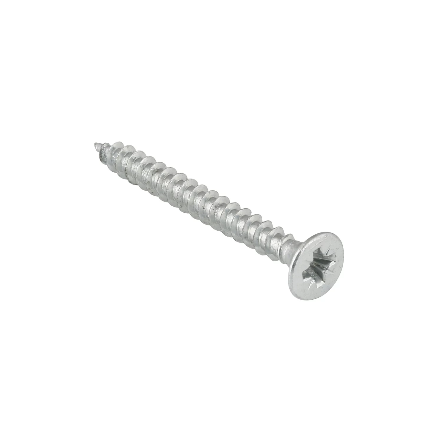 Verzinkte universeel schroef met platverzonken-kop en torx aandrijving. De schroef is voorzien van een waslaag t. b. v. een betere verwerking