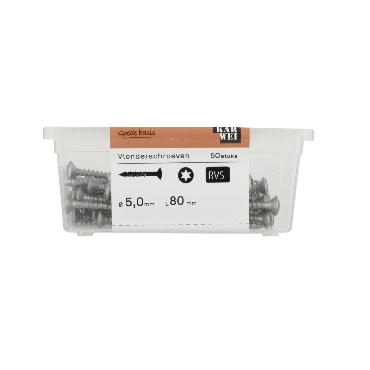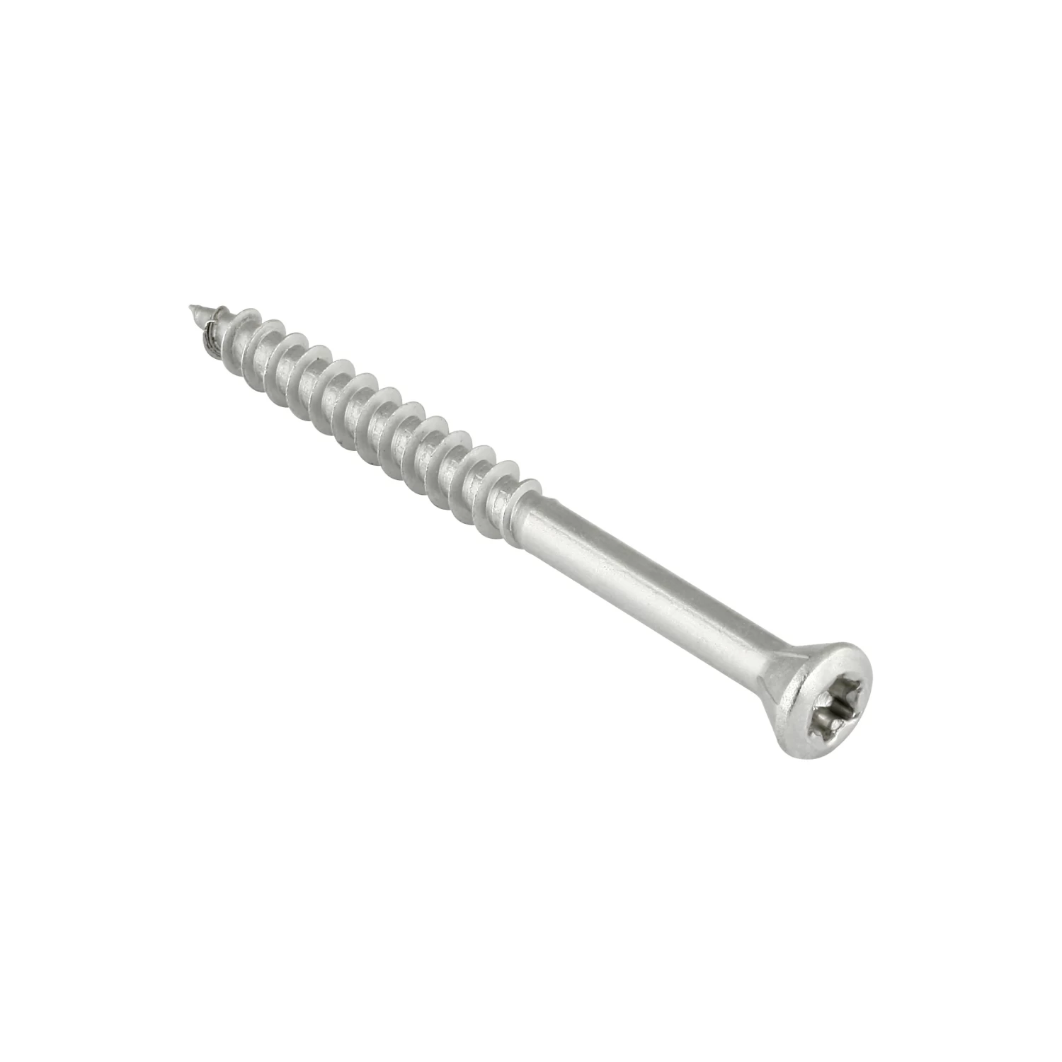 RVS vlonderschroef. De kop verzinkt zich in het hout. Het splijten van het hout is bijna uitgesloten. Voorboren is alleen bij de kopse kanten nodig.