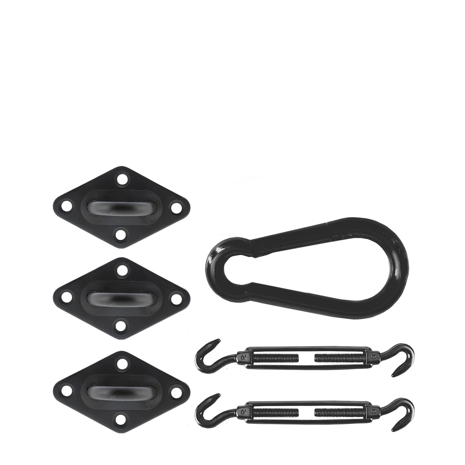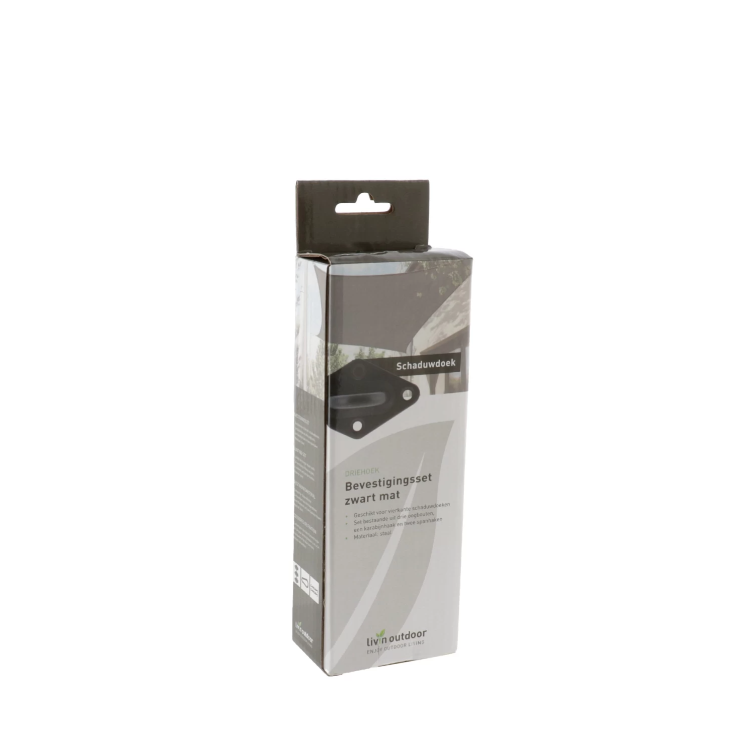 Voor het gebruik en levensduur van een schaduwdoek is het erg belangrijk om deze goed te bevestigen. Met deze bevestigingsset kan gemakkelijk een driehoek schaduwdoek bevestigd worden aan een muur of paal. De set bestaat uit één karabijnhaak, twee spanners en drie platen met oog.