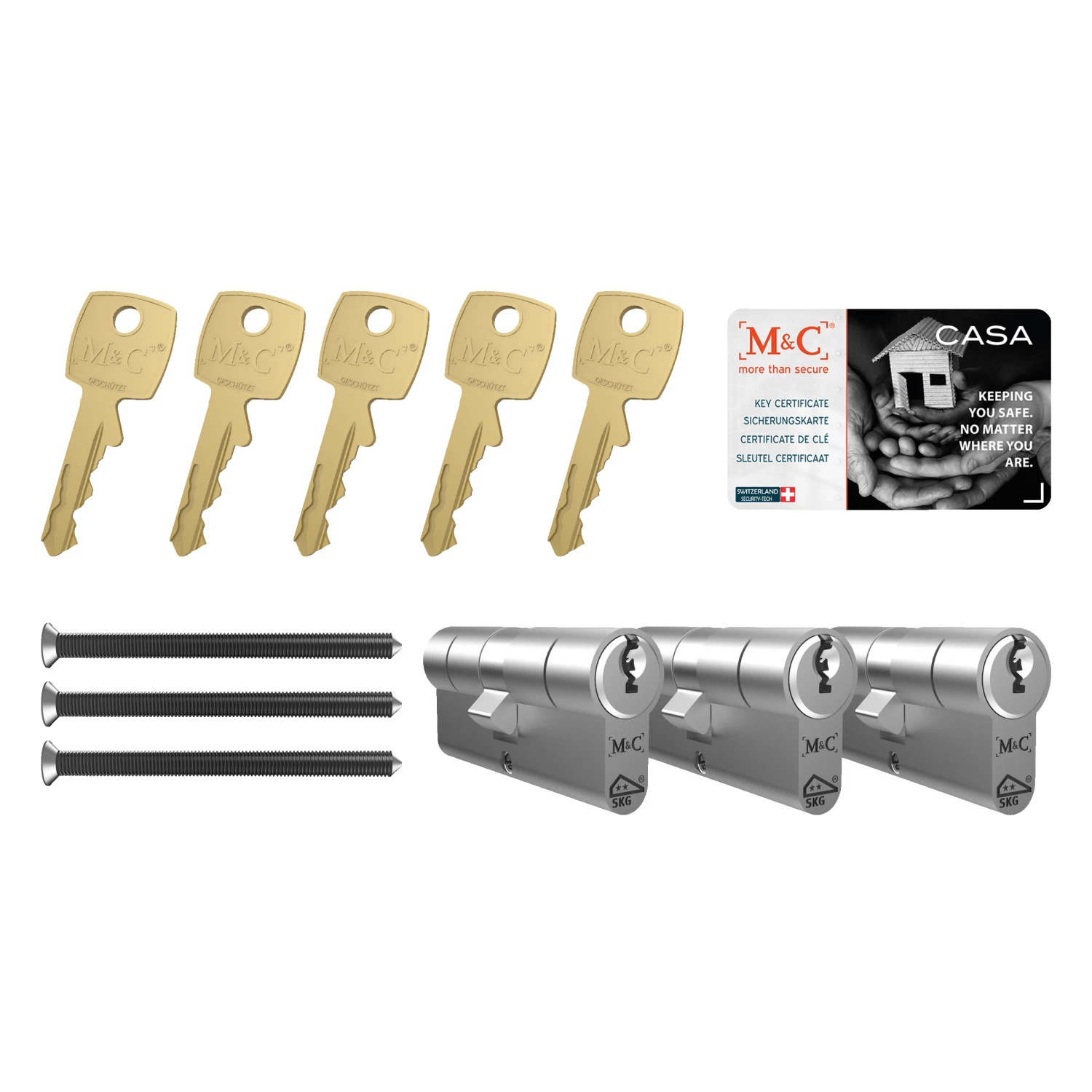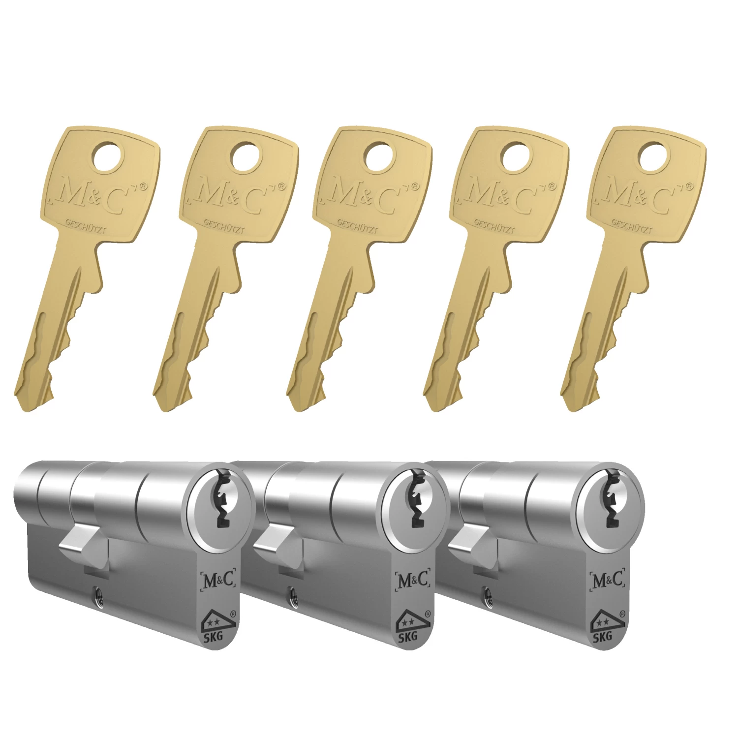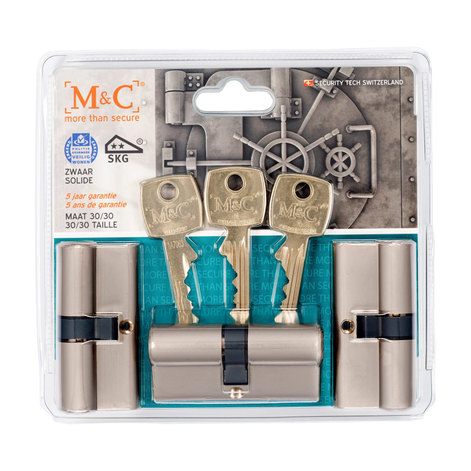 De M&C veiligheidscilinder is een profielcilinder voorzien van zowel het SKG 2-sterren keurmerk als het Politiekeurmerk Veilig Wonen. Producten met het SKG 2-sterren keurmerk voorkomen zelfstandig het binnendringen van inbrekers met ten minste 3 minuten, of in combinatie met andere inbraakwerende voorzieningen met ten minste 5 minuten. Hierdoor ben je zeker van een goede beveiliging van het slot. Omdat de veiligheidscilinder is voorzien van dit keurmerk wordt deze geadviseerd voor buitendeuren. Voor een optimale veiligheid is de deur dan ook voorzien van een slot en deurbeslag met het SKG keurmerk. De maat van deze cilinder is 30/30Â mm wat de meest gangbare maat is zodat deze geschikt is voor de meeste (buiten)deuren van 38 tot 44 mm dikte. De cilinder wordt geleverd als set van drie cilinders inclusief 5 sleutels en bevestigingsbouten.