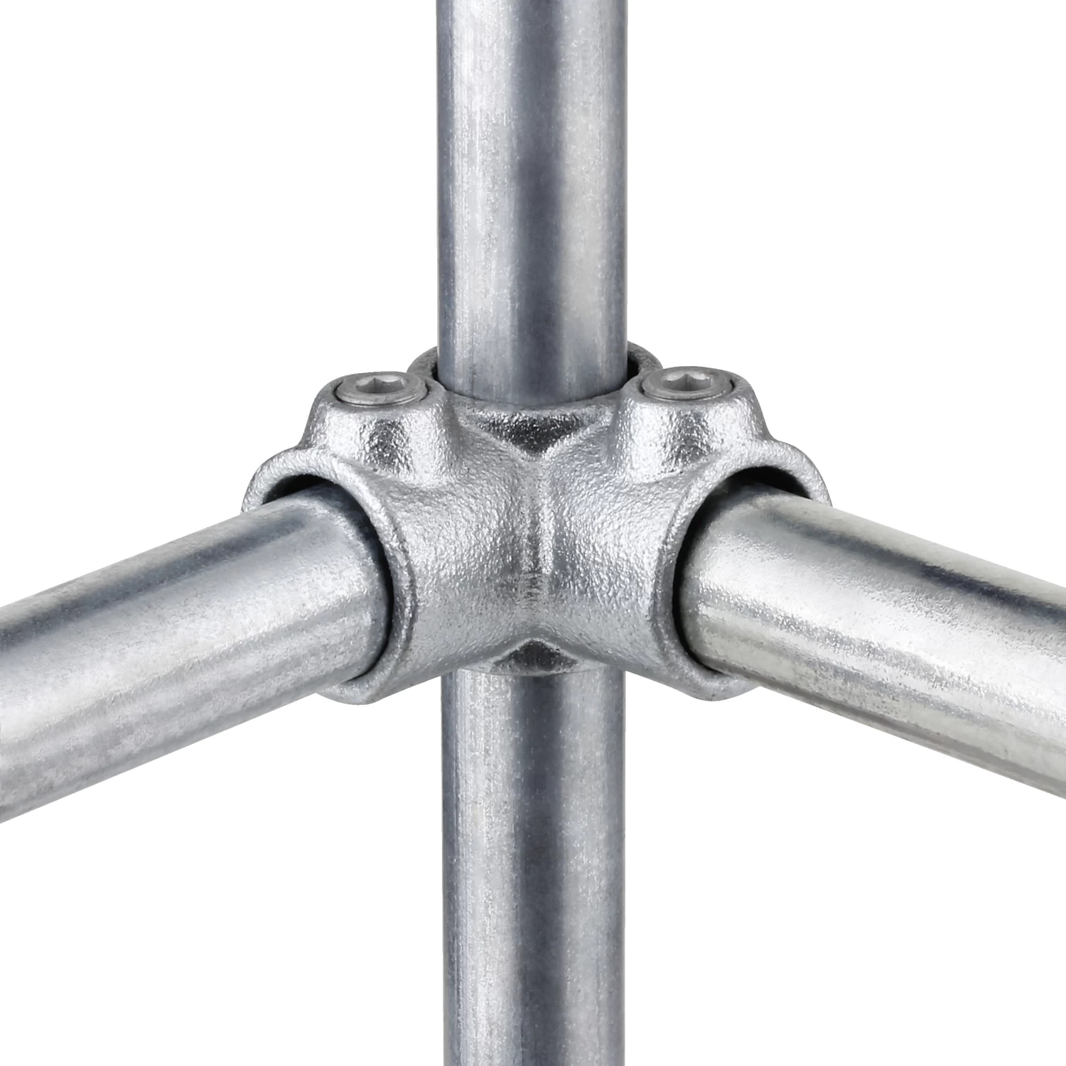 Novidade steigerbuis koppelingen voor een industriële look. Novidade steigerbuis koppelstuk hoekstuk 27 mm verzinkt gebruik je om 3 buizen onder 90 graden aan elkaar te maken, waarbij de middelste doorloopt. De verzinkte steigerbuis koppelingen zijn ook geschikt voor buiten.